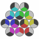 This puzzle consists of 12 hexagonal pieces. Clicking one of 3 central pieces rotates the area including the clicked piece and 6 surrounding pieces by 60° |