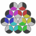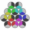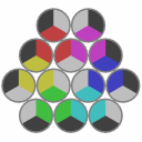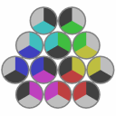 This puzzle consists of 12 hexagonal pieces. Clicking one of three central pieces flips the piece and surrounding 6 pieces, around the axis connecting the center of the piece and the nearest corner or edge of the hexagon. |